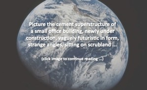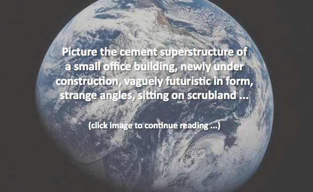 Picture the cement superstructure of some future small office building, vaguely futuristic in form, strange angles, sitting on scrubland. No walls yet, just empty space between the beams.