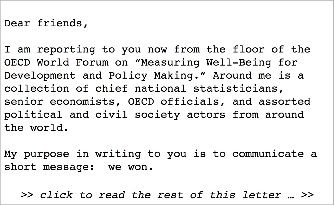 I am reporting to you now from the floor of the OECD World Forum on “Measuring Well-Being for Development and Policy Making.” Around me is a collection of chief national statisticians, senior economists, OECD officials, and assorted political and civil society actors from around the world.