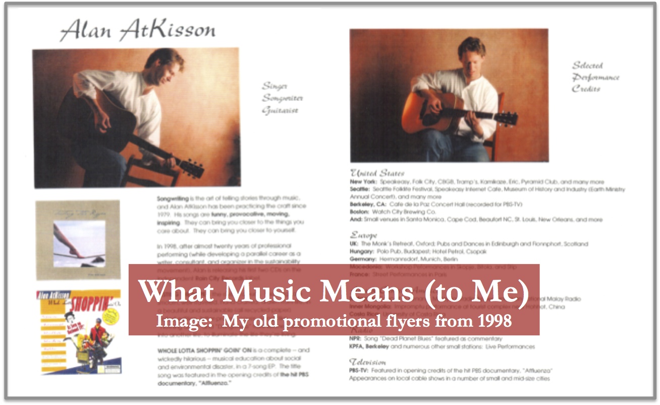 As I wrote in my book Believing Cassandra, music came back into my life out of emotional necessity. I spent much of my 20’s working as a professional musician, performing in the rock and folk clubs of New York. Then I changed career tracks, and became a sustainability expert. But my early professional plunge into issues such as climate change, poverty, oppression, and biodiversity loss (starting in 1988) stirred up some strong emotions. Writing songs, starting with the dark comedy song “Dead Planet Blues,” helped me to express those emotions and deal with them … and probably helped me avoid drinking too much whiskey.