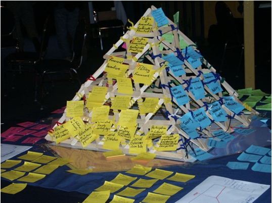 The Final Product. That is how Pyramid became a teaching and planning workshop. Over the course of one or two days, building a Pyramid takes a group of people – students or professionals – on a journey of learning and discovery, or sometimes a process of planning. They envision sustainability for their organization, community, or school. They develop simple indicators to reflect that vision, using the Sustainability Compass. They practice systems thinking with those indicators and look for what Donella Meadows called “Places to Intervene in a System” – more simply known as leverage points. Then they brainstorm ideas for specific things to change, at those leverage points. Finally, they build strategies for how to make those changes happen.
