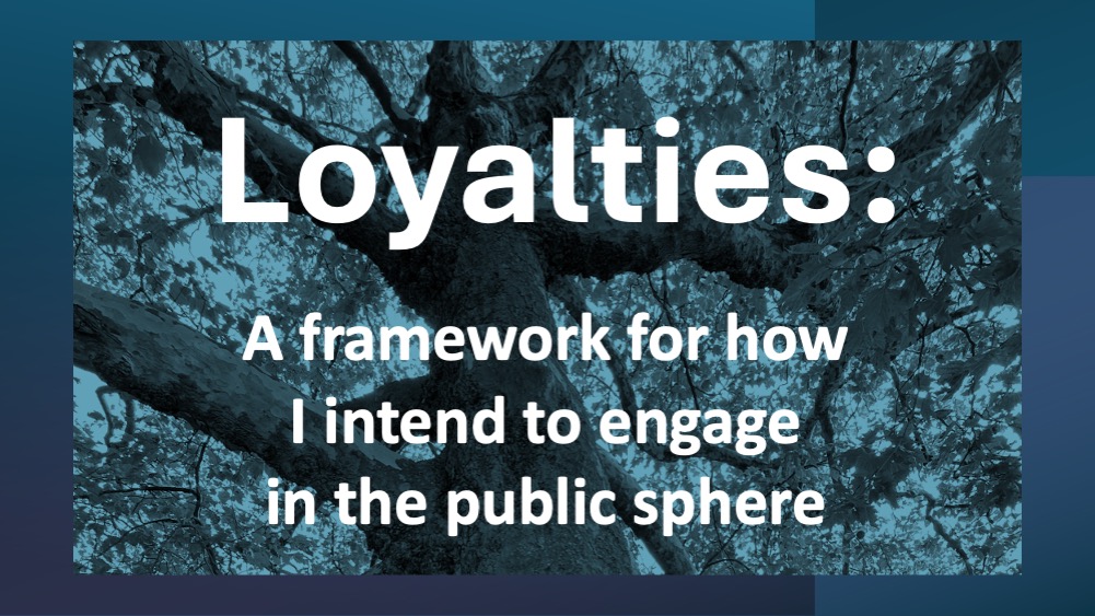 This first-draft list of my publicly declared loyalties is not comprehensive, nor is it presented as some kind of hierarchy of values. It will no doubt evolve over time.