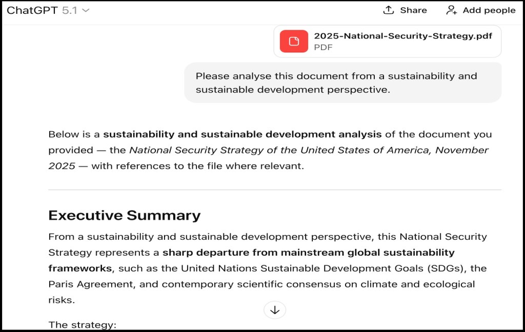 After reading the new National Security Strategy of the United States of America, recently released by the White House, I thought, “I used to advise US military bases on their sustainability programs. This new strategy seems to be a major change in direction, and it has enormous implications for sustainability and sustainable development work, globally. Perhaps I should analyze this document, as objectively and neutrally as I can, and write about that.” Then I became curious: what would a US-based AI do with that same task? So I uploaded a PDF of the document and typed the following prompt into ChatGPT: “Please analyse this document from a sustainability and sustainable development perspective.” (I always say please when talking with AIs. Just in case.)